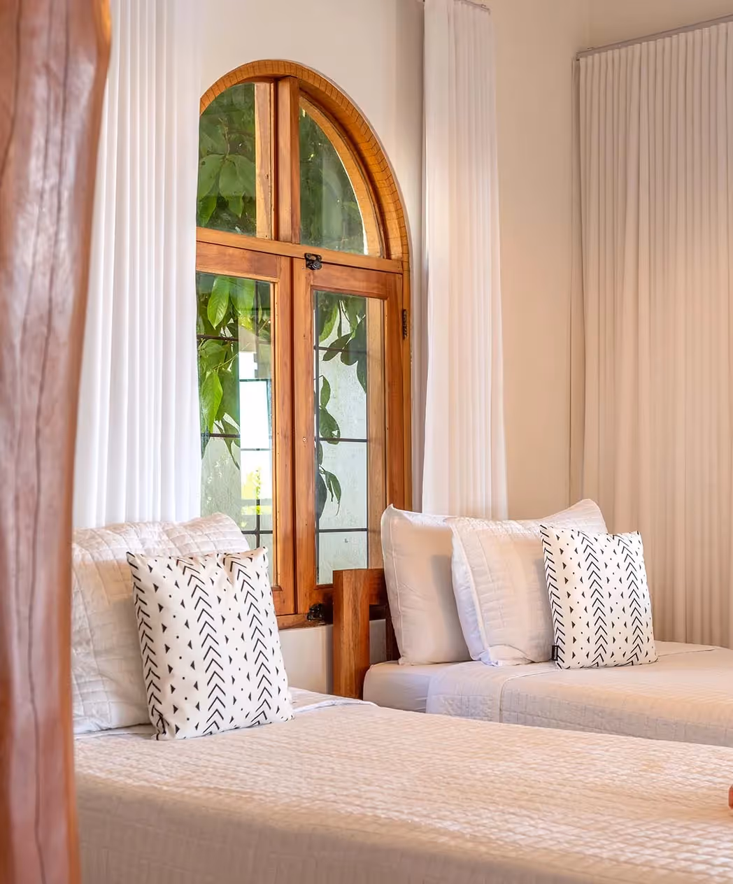 Dharma 2 is a bright, ocean-view room located directly off the yoga shala, making it an easy and inspiring space for retreat guests. It features two queen beds, air conditioning, a mini fridge, and a private bathroom. Large doors open to ocean breezes and views of Playa Pelada, with the sound of the waves often drifting in during morning and evening hours. It’s a comfortable, relaxed space ideal for shared accommodations.