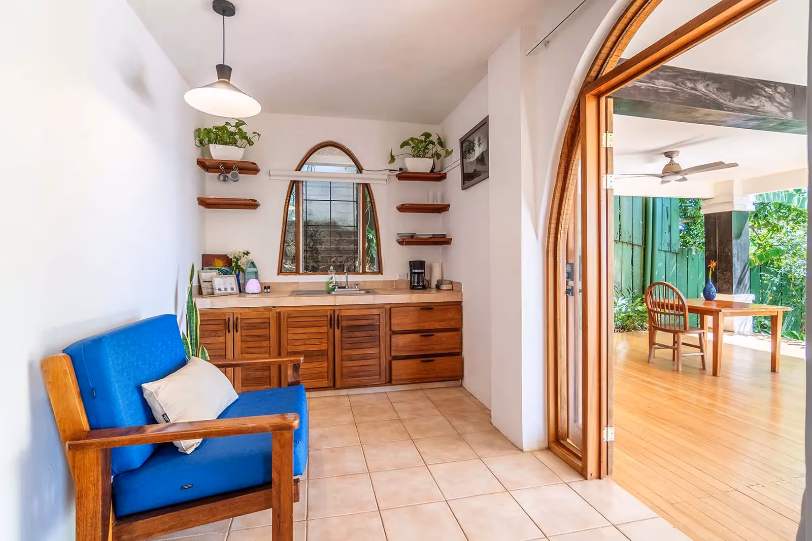 The Dharma 1 studio is perfect for a couple, small family, or friends sharing a room on a retreat. Enjoy this spacious villa with jungle and pool views, two queen beds, air conditioning, kitchenette, and bathroom. The large, covered wood patio includes an outdoor seating area is the perfect spot to sit back relax and enjoy the surrounding sounds of the jungle.