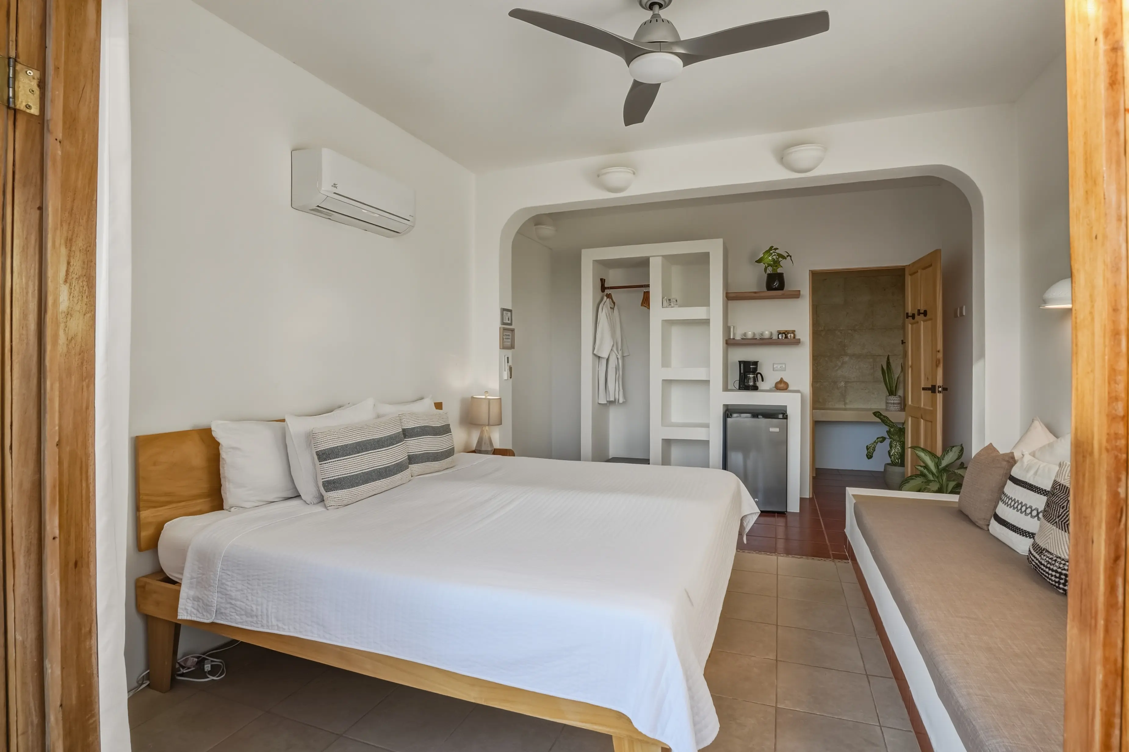 Karma 3 is a bright, ocean-view room with a flexible sleeping setup to suit different group needs. The king bed can be split into two twin beds, making it ideal for friends sharing or solo travelers pairing up. The room features a private bathroom, air conditioning, a mini fridge, coffee maker, and an air diffuser, creating a comfortable place to recharge throughout the day.