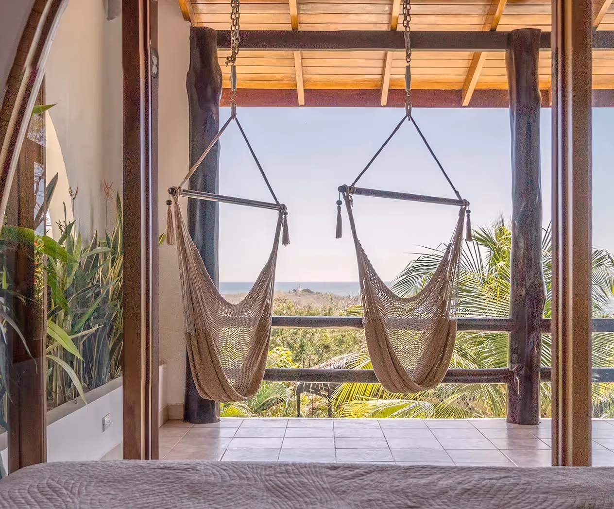 This three-bedroom, two bathroom penthouse villa has some of the best views in the area. The expansive ocean view extends from the south end of Guiones to the north end of Pelada. Enjoy this space with friends, family, or other members on your retreat with central AC, full kitchen, living room, large balcony and outdoor table. Relax on the porch with a book in one of the 4 hammock chairs enjoying the ocean breeze and watching the sun set over the Pacific.